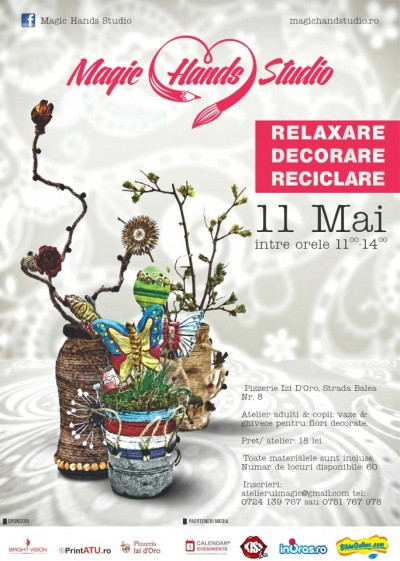 Pe ideea de ecologic art decoration, va propunem acest atelier dedicate adultilor si copiilor, la care vom invata cum sa realizam vaze ingenioase si suporturi pentru pixuri folosind sticle, borcane, sfoara, vopsele acrilice si multe alte elemente decorative neconventionale.