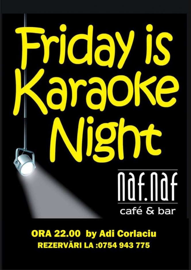 „Friday is Karaoke Night” by Adi Corlaciu When 07/03/2014 - 08/03/2014 10:00 PM - 3:00 AM Add To Calendar Download ICS Google Calendar iCalendar Office 365 Outlook Live Where Naf Naf cafe & bar str. Marasesti, nr.1, Sibiu, Sibiu, Sibiu Event Type Club - Pub - Cafe Karaoke Adi Corlaciu, karaoke, nafnaf, sibiu Loading Map.... str. Marasesti, nr.1 - Sibiu View Events 45.78451966346817 24.150528154244967
