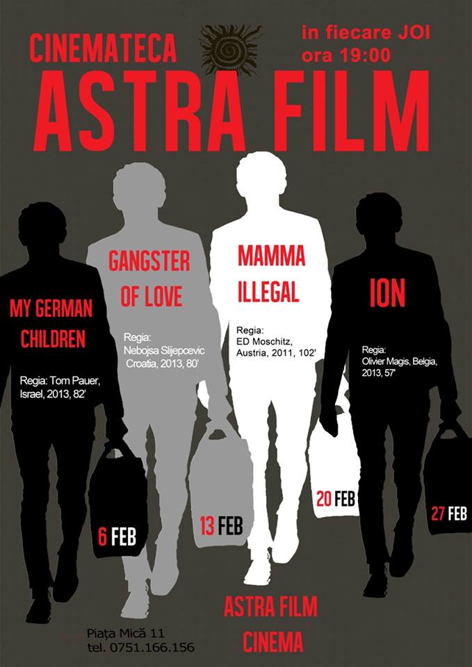 Primul titlu din această lună este My German Children (regia Tom Pauer) din selecţia oficială AFF 2013, programat joi, 6 februarie 2014. Filmul este un jurnal video despre apartenenţă şi identitate, în care se reflectă asupra motivelor pentru care fiul cel mare al regizoarei îşi doreşte să se întoarcă în Germania după doar un an petrecut în Israel, ţara de origine a mamei sale.