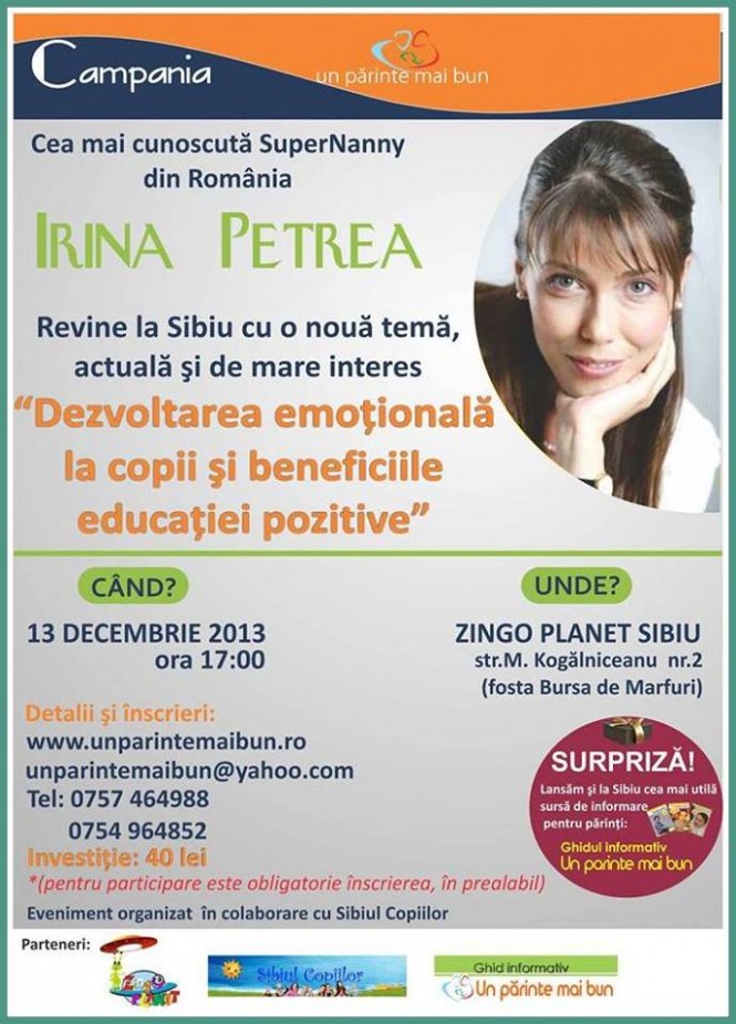 Asociaţia pentru formare şi dezvoltare continuă, în parteneriat cu Sibiul Copiilor, organizează în data de 13 decembrie 2013, ora 17:00, Conferinţa “Inteligenţa emotională la copii şi beneficiile educaţiei pozitive”, susţinută de Irina Petrea, cunoscută pentru emisiunile sale de televiziune “SuperNanny”, “Copii contra părinţi”, “Cei 7 ani de acasă” (dar şi pentru cărţile, publicaţiile, articolele şi interviurile sale).